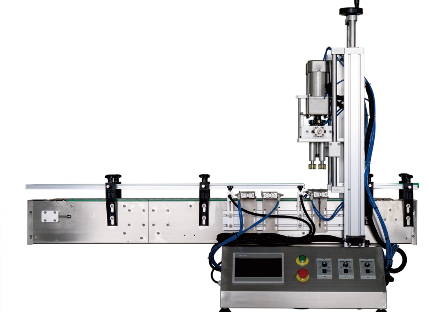 全自动四轮旋盖机 适用于各种日化 ,医药 ,食品行业的喷头 ,泵头 ,圆瓶盖 ,压嘴盖等等瓶盖锁盖机械 ,采用电气组合控制运动 ,稳定性高 ,可锁不同形状规格的瓶盖 ,锁盖转速可调节 ,可根据不同瓶盖调节松紧度 ,操作简单。 桌面式旋盖机 适用于各种日化 ,医药 ,食品行业的喷头 ,泵头 ,圆瓶盖 ,压嘴盖等等瓶盖锁盖机械 ,采用电气组合控制运动 ,稳定性高 ,可锁不同形状规格的瓶盖 ,锁盖转速可调节 ,可根据不同瓶盖调节松紧度 ,操作简单。